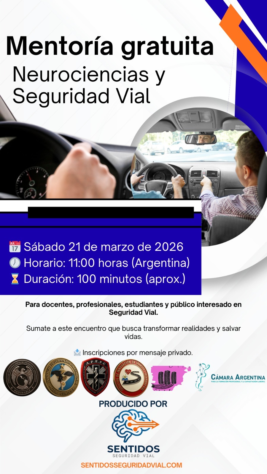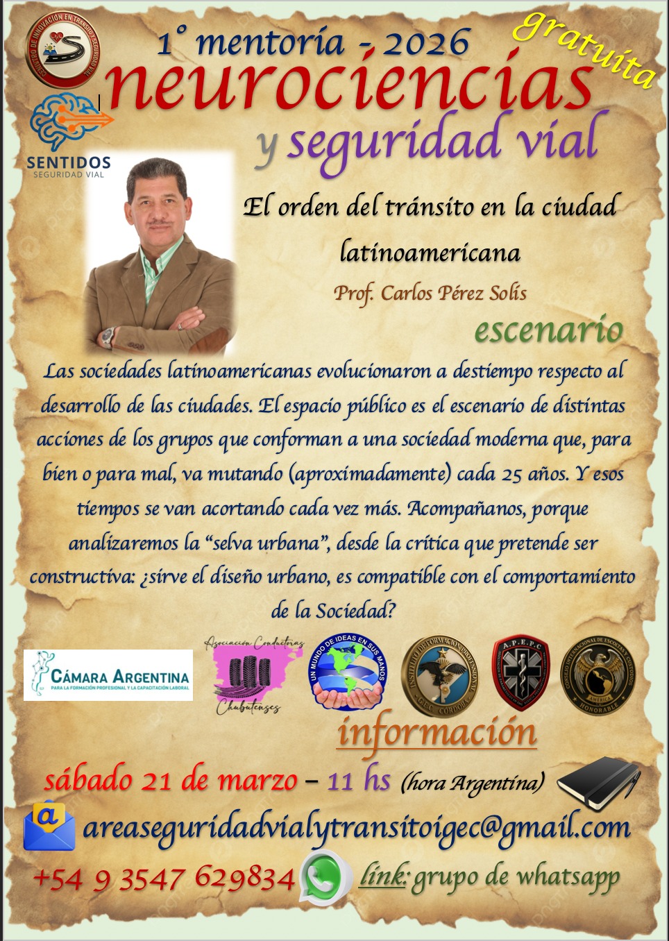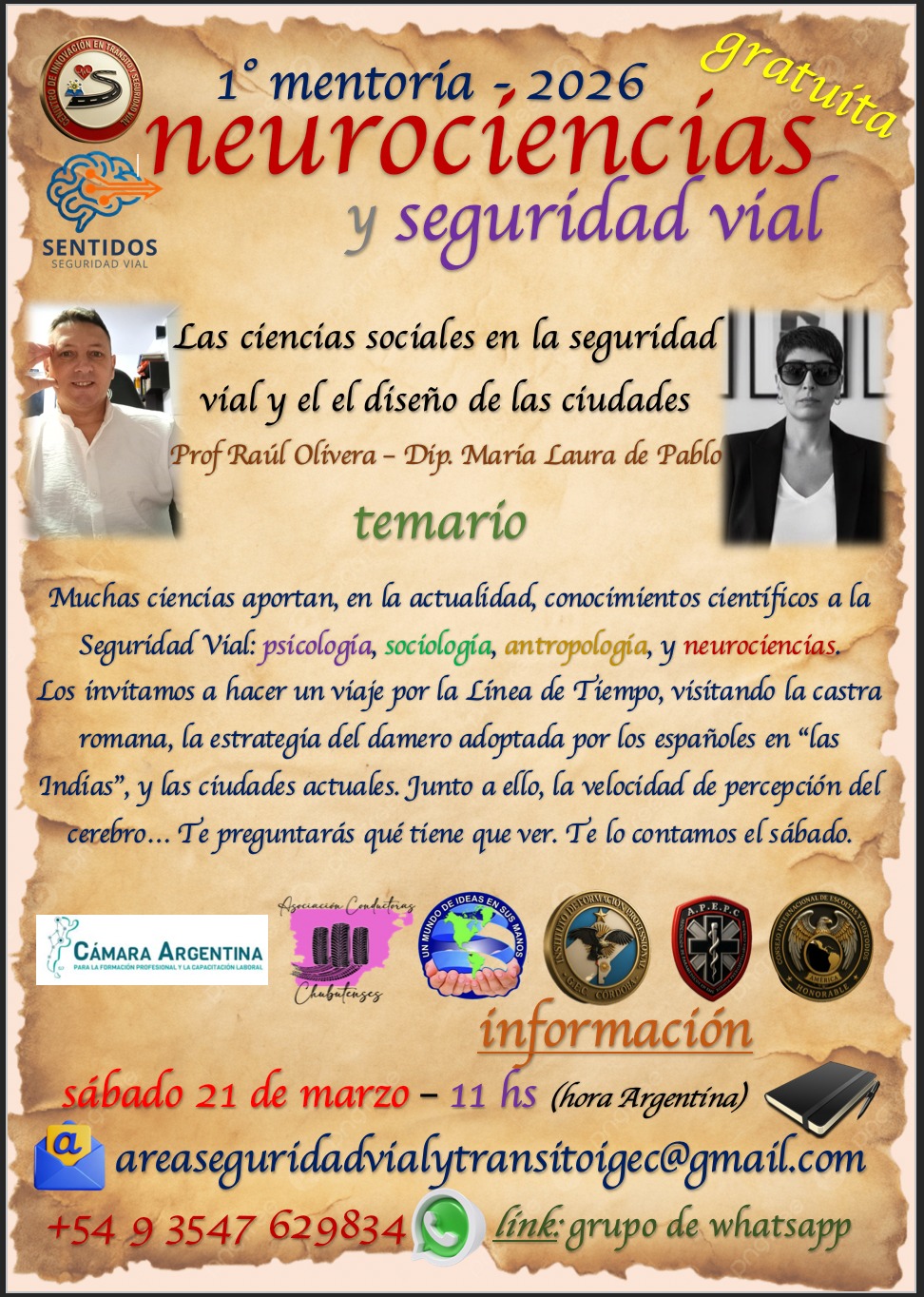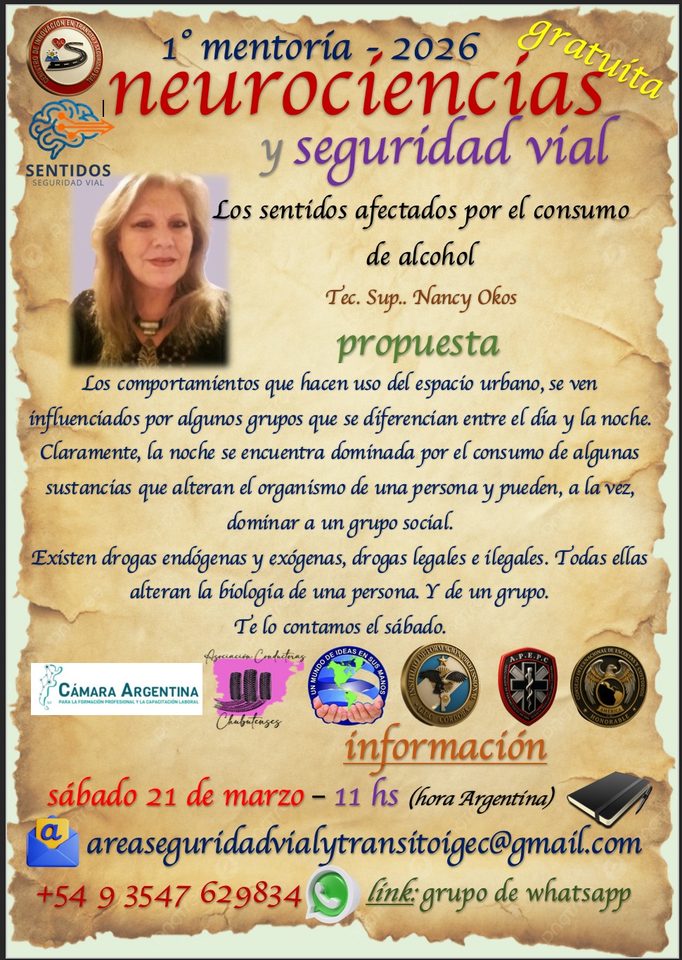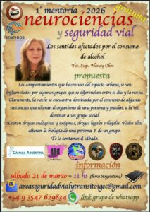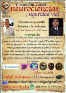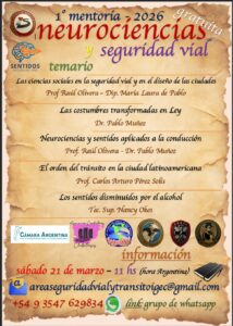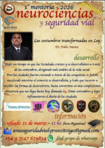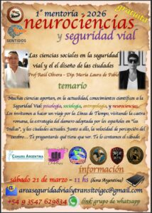Noticias CICLO NEUROCIENCIAS y SEGURIDAD VIAL nancy okos 17 marzo, 2026 CICLO NEUROCIENCIAS Y SEGURIDAD VIAL (21/3 y 12/4) MENTORÍA 1: LOS ECOS DE LA HISTORIA EN LA ACTUALIDAD Sábado 21 de Marzo. 100 minutos, dando comienzo a las 11 hs (Hora Argentina). TEMARIO + Introducción de las ciencias sociales en la seguridad vial + Las ciencias sociales en el diseño de las ciudades + Las costumbres que tuvieron que transformarse en leyes para ordenar las sociedades, y cómo se ordenó el peatón con los caballos y los carros (hasta no hace mucho), y con los vehículos en la actualidad + Neurociencias (sentidos), y sentidos aplicados a la conducción + Los sentidos disminuidos por el alcohol Navegación de entradas Anterior Entrada anterior: UTV/ CUATRICICLOS Deja una respuesta Cancelar la respuestaTu dirección de correo electrónico no será publicada. Los campos obligatorios están marcados con *Comentario * Nombre * Correo electrónico * Web Noticias Relacionadas Noticias UTV/ CUATRICICLOS 13 febrero, 2026 0 Noticias RUTA 5. SINIESTROS FATALES: 2013-2024. GRACIAS SILVIA GONZALEZ- FUNDACION ESTRELLAS AMARILLAS LA PAMPA. 4 febrero, 2026 0